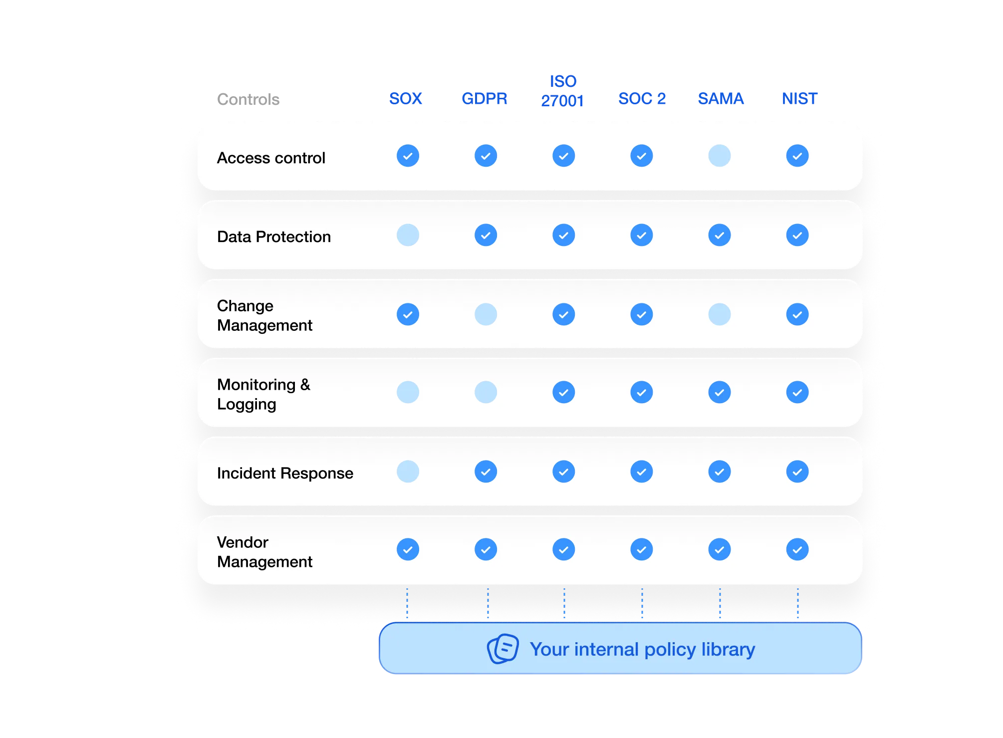 Map multiple frameworks and regulations to each other, eliminating redundant work across SOX, GDPR, SOC, ISO 27001, NIST, SAMA, CPRA and beyond.