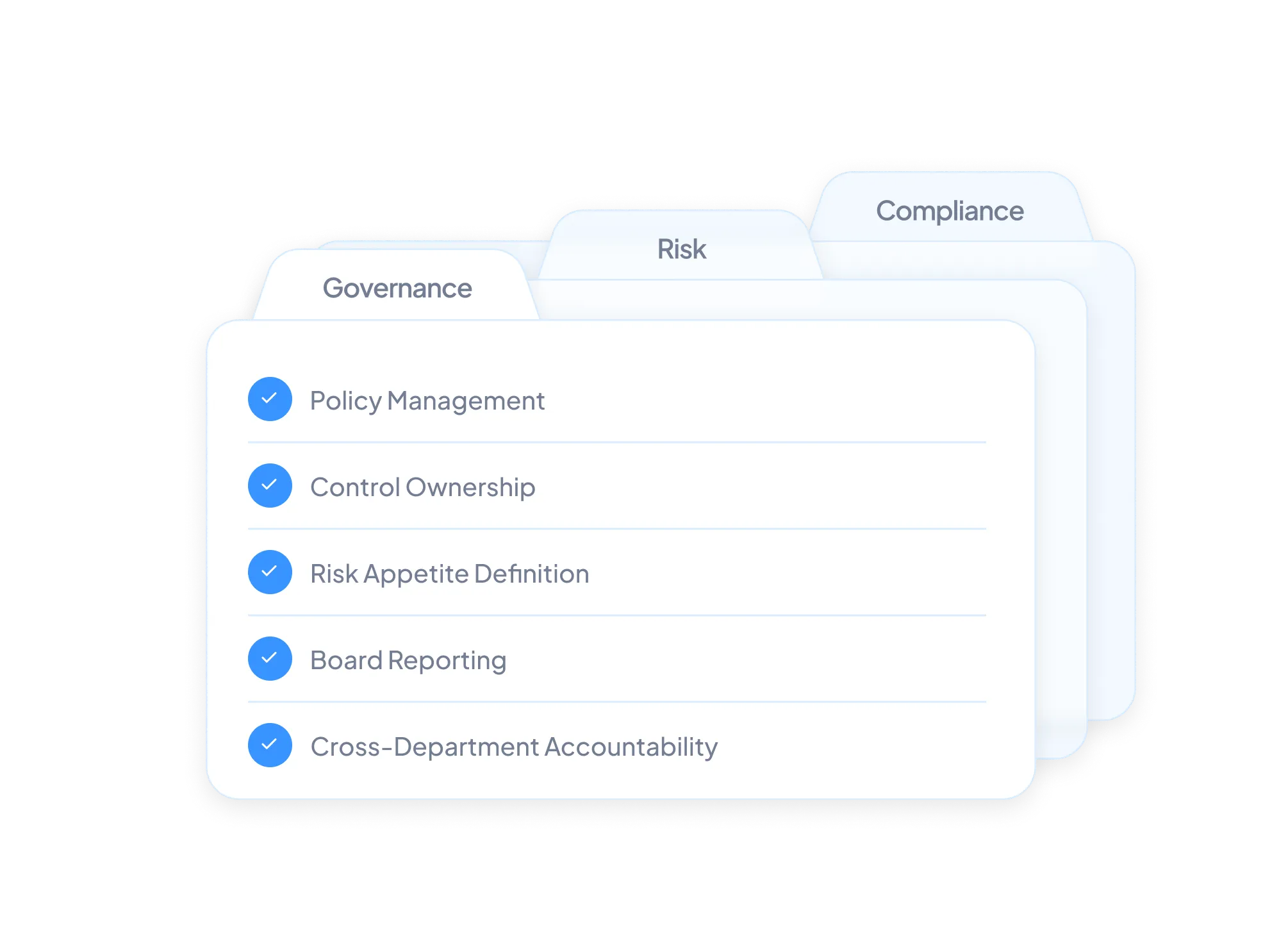 Here, governance comes first: the policies that move your business forward, the controls that contain risk across every department, and the compliance that follows naturally from both.